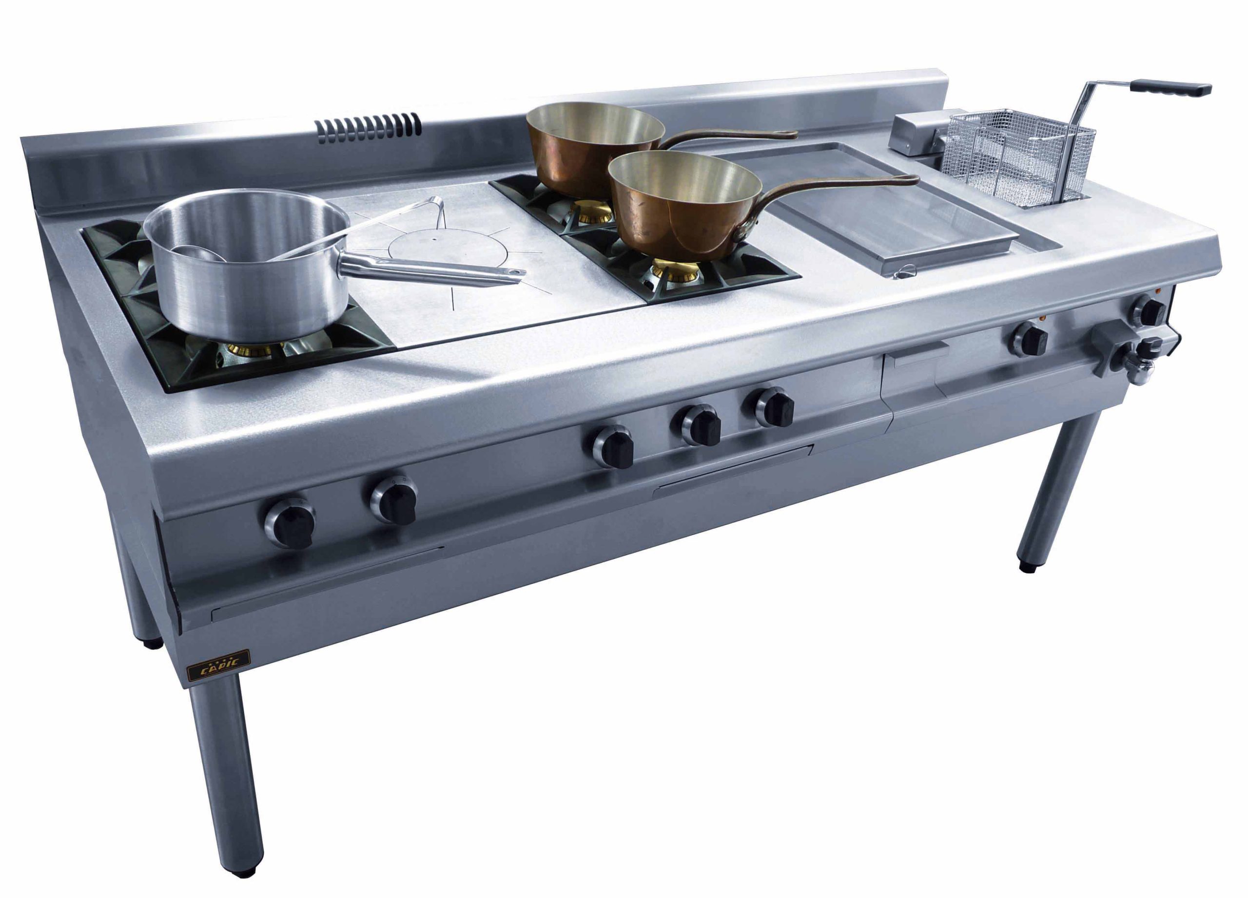 Composé de 2 feux sous grilles fonte (300x275 de 4,8 kW unitaire), 1 plaque coup de feu (400x500 de 6 kW unitaire), 1 plancha inox électrique de 3 kW thermostatée avec gouttière périphérique, tiroir en façade (surface utile 17,5 dm2), le Capichef est non modulable est peut être installé sur n’importe quel type de soubassement.