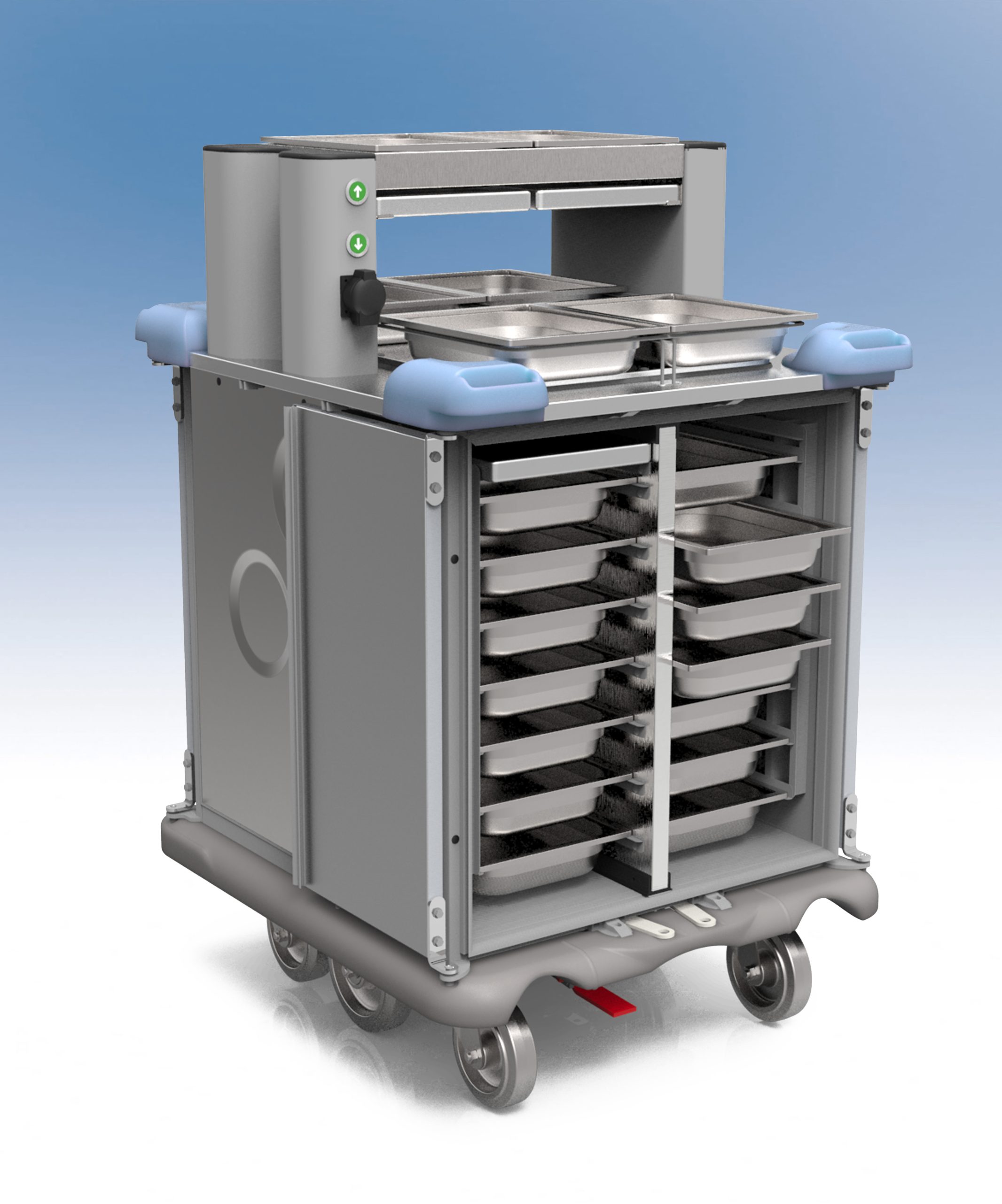 Vient ensuite le Compactserv Insert. Après avoir conçu le chariot à technologie embarquée Compactserv, Socamel Technologies invente un chariot à technologie dissociée permettant le transport en camion et supprimant les contraintes liées au manque d’espace. Immobile en office, il se charge du maintien et/ou de la remise en température des plateaux repas lorsqu’il est associé à l’Insert. Il se désolidarise du Compactserv lorsque le cycle est terminé pour gérer la distribution des repas en chambre.