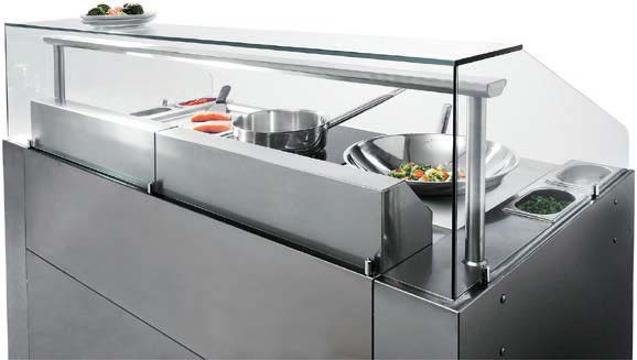 Le Show-Cooking Visio est parfaitement protégé tout en restant visible grâce à un vitrage conçu pour assurer une cuisine spectacle et conviviale. Une dépose pour plats et pour assiettes est accessible sous le plan de travail et des bacs GN sont situés de part et d’autre pour contenir des ustensiles ou ingrédients variés. Le Show-Cooking Visio se veut à la fois mobile et solide. En effet, il a été conçu pour être un meuble complet, robuste, aux finitions de qualité en acier inox 18/10 (Aisi 304) transportable à volonté pour une cuisine