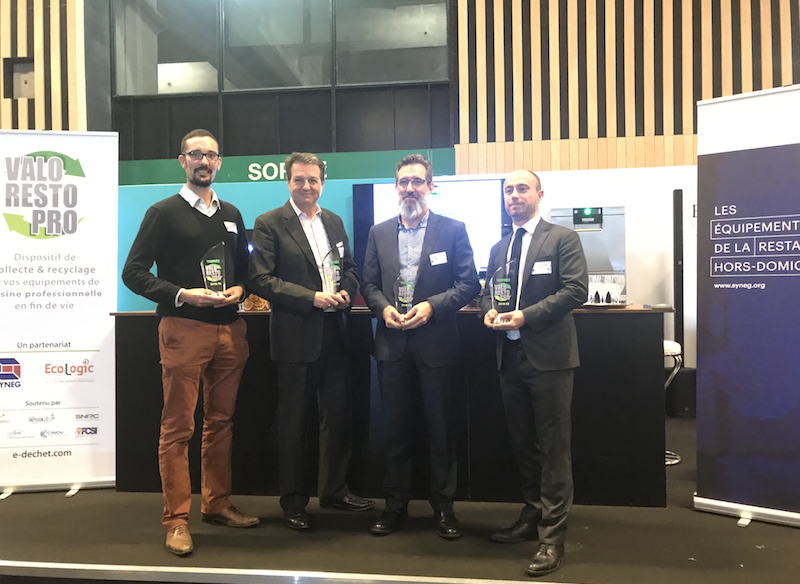 Les Trophées Valo Resto Pro ont été remis à l’occasion du salon Equip’Hotel au Parc des expositions de Paris-Porte de Versailles, mardi 13 novembre dernier. Décernés par le Syneg et l’éco-organisme Ecologic, ces prix visent à promouvoir les actions environnementales liées à l’économie circulaire. S’adressant à tous les acteurs de la filière (utilisateurs, installateurs et distributeurs, bureaux d’études et fabricants), ils récompensent trois catégories d’engagement : la meilleure démarche d’éco-conception dans les cuisines professionnelles ; la meilleure performance de collecte des équipements en fin de vie et, nouveautés 2018, la meilleure action de communication en faveur de la collecte et du recyclage des équipements en fin de vie.
