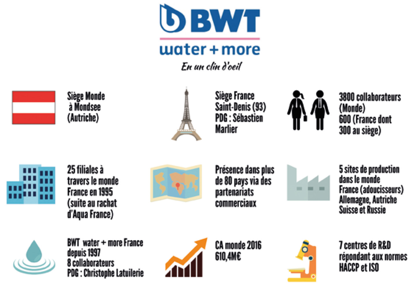 d’une usine de produits chimiques. « Avec le temps, l’activité de la société a évolué pour se concentrer uniquement sur le traitement de l’eau », indique Émeline Follias en charge de la communication chez BWT water + more. En effet, en 1910, la société est vendue à Theodor Pitzmann et August Pfeiffer, deux repreneurs spécialisés dans la construction de canalisations d’eau et diverses constructions mécaniques. Parallèlement est fondée en 1949, Mondseer Armaturen Werke à Mondsee en Autriche, une société dédiée à la fourniture d’équipements hydrauliques. Bien