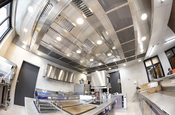 Ancienne maison bourgeoise du XVIIè siècle située à Douai (59), le restaurant La Maison Prévost du chef étoilé Jérôme Prévost a été entièrement rénové. Et c’est Alvene, spécialiste de la ventilation des cuisines professionnelles, qui a été sélectionné afin d’équiper la cuisine centrale de l’établissement d’un plafond filtrant Isotech. En collaboration avec la société d’installation Miroux, Alvene a réalisé un travail d’un mois afin d’harmoniser le plafond de 25 m2 avec l’aménagement de la cuisine, tout en respectant les contraintes techniques imposées par la présence d’un piano central, d’un support mural et d’un piquage sur réseau de ventilation. Ce plafond filtrant Isotech « 100% made in France » dispose d’une extraction homogène sur toute sa surface et d’un soufflage basse vitesse périphérique. Réalisé en acier inoxydable austénitique AISI 304 brossé grain 220 sur les deux faces pour l’ensemble des parties visibles, il ne présente aucune visserie apparente dans le volume de cantonnement. Enfin, l’éclairage du plafond est constitué de spots LED à faible consommation pour une lumière uniforme.
