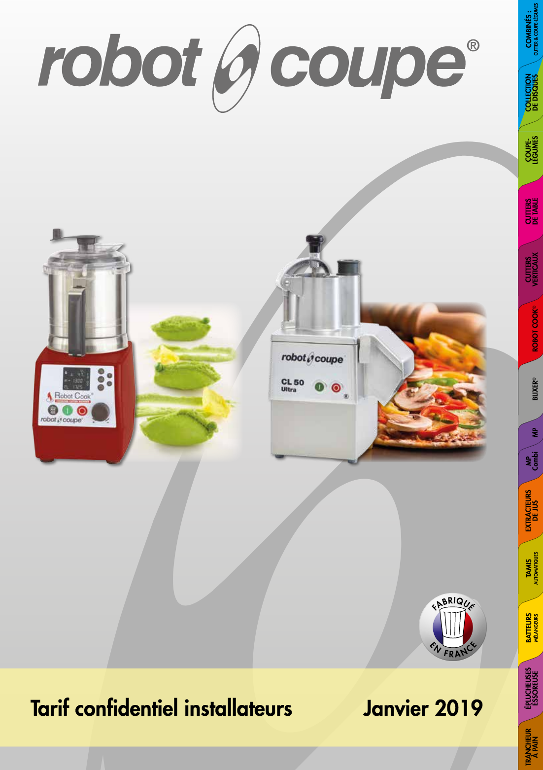 Robot-Coupe dévoile son nouveau Tarif 2019, applicable au 1er janvier 2019. Support idéal pour faire découvrir les gammes de produits Robot-Coupe et apporter des solutions optimales aux professionnels, le catalogue pourra être présenté par un responsable régional Robot-Coupe, et des démonstrations pourront être réalisées sur place. Les Distributeurs ou Bureaux d’Études disposent notamment d’un espace réservé sur www.robot-coupe.fr leur permettant de consulter et de télécharger documentation commerciale, notices d’utilisation, guide de sélection, Nouvelles Fiches spécifications et autres figurines 2D et 3D, avec le format BIM.