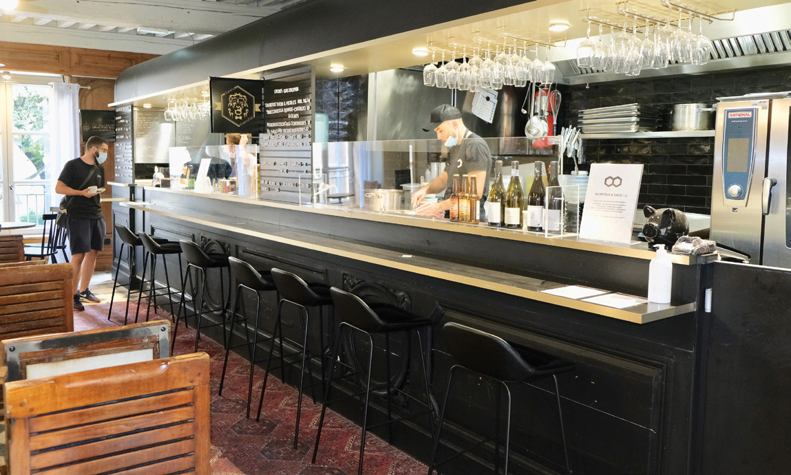 propriétaires du restaurant Les Apothicaires à Lyon. Mais, le Covid-19 engendre un coup d’arrêt de l’activité qui était pourtant vite montée en puissance, avec une moyenne de 1 500 clients par jour (et jusqu’à 2 500). Depuis sa réouverture début juin, le Food Traboule accueille 600 à 1 000 clients par jour, avec 170 places assises au lieu de 240, un système de réservation pour le premier service du soir, des QR codes sur les tables, des fontaines à eau revêtues d’un film plastique virucide, une équipe de nettoyage et désinfection, les masques obligatoires et plexiglas devant