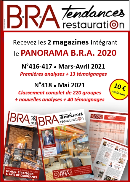 > Le 1er volet du Panorama B.R.A. est au cœur de B.R.A. n°416-417 qui compte aussi un cahier spécial Covid-19 (bilan, aides, initiatives...). Il comprend une première analyse de Food Service Vision, 13 témoignages exclusifs de dirigeants, et les résultats d'un sondage auprès des dirigeants de la restauration. Recevez ce magazine pour 5€. Achat en ligne rapide et pratique via ce lien: https://www.laboutiquerhf.com/common/product-article/271