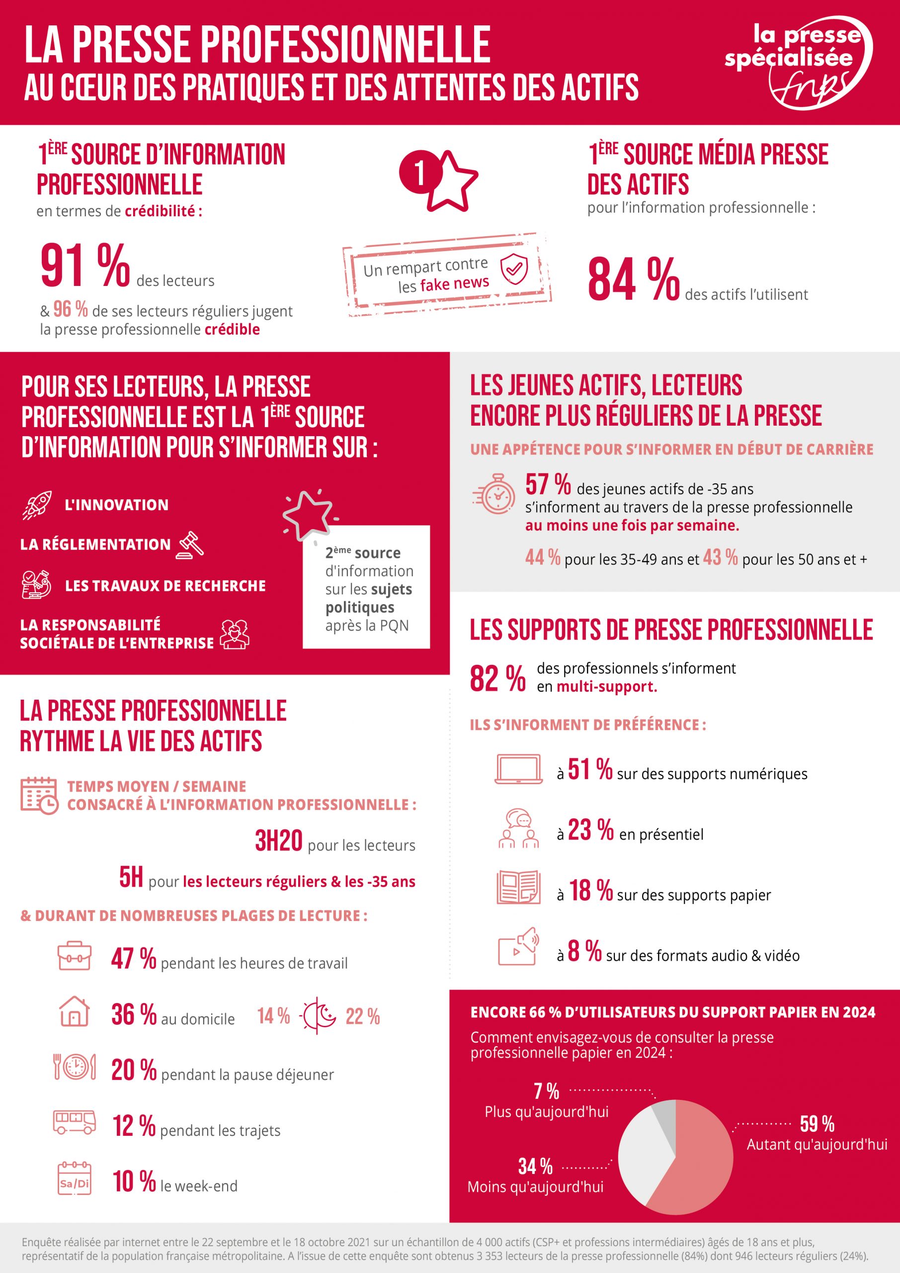 Menée avec l’objectif de « dresser un panorama des pratiques, besoins et attentes en matière d’information professionnelle », elle révèle notamment que 84 % des actifs utilisent la presse professionnelle pour s’informer, dont 23 % régulièrement. Ces chiffres placent la presse professionnelle devant la Presse quotidienne nationale (PQN), la Presse quotidienne régionale (PQR) et les réseaux sociaux, qui informent respectivement 80 %, 79 % et 76 % des actifs.