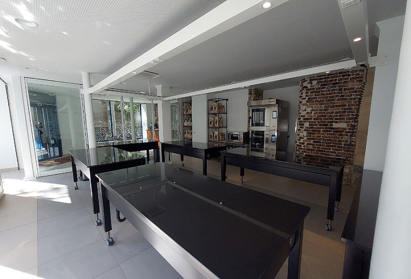 minimaliste. » Le ton est donné. La nouvelle École Valrhona, située au croisement de la rue des Archives et de la rue de Braques à Paris (75003), se distingue clairement de la plupart des établissements de formation par sa conception, imaginée avec le concours de Thierry Bridron, chef pâtissier exécutif de l’École Valrhona. Sessions de perfectionnement ou de créations, approfondissement technique et réflexions diverses s’y tiennent sur 3 niveaux, soit 550 m² de surface – dont 78 m² de laboratoire