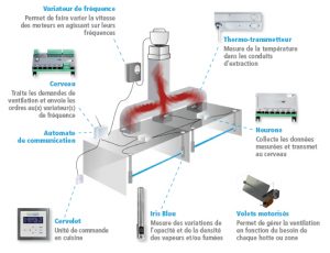 Puisqu’il communique avec la sonde de température et le cerveau du système, ce dernier peut alors adapter la vitesse de rotation des moteurs en fonction des besoins d’extraction identifiés en temps réel. La vitesse de ventilation des hottes de cuisine est ainsi régulée en agissant sur la vitesse des moteurs d’extraction des hottes et sur la compensation (Centrale de Traitement d’Air).