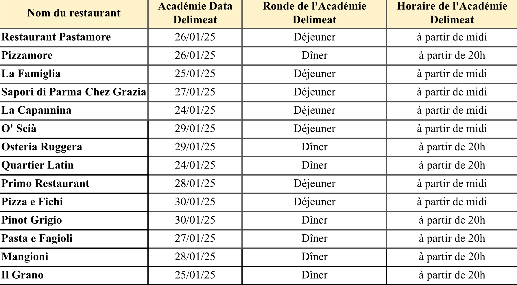 Du 24 janvier au 25 février 2025, Mortadella Bologna IGP, Salamini Italiani alla Cacciatora AOP, Zampone et Cotechino Modena IGP seront les protagonistes de pas moins de 322 journées promotionnelles qui se dérouleront dans 14 restaurantsde la capitale française. En outre, 14 “Delimeat Academy” serontorganisées par le Chef Ambassadeur Andrea Palmieri.
