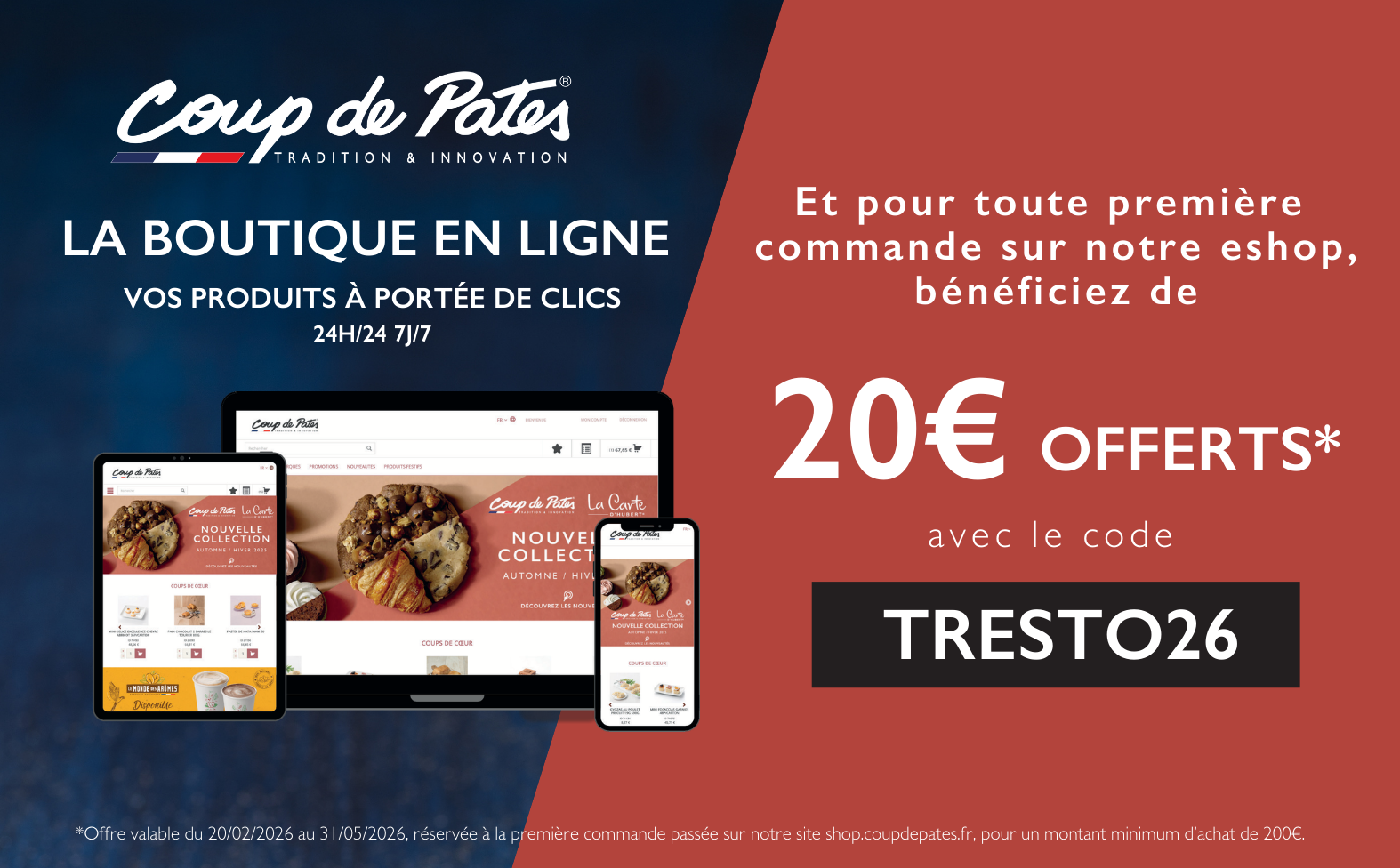 Bénéficiez de 20 € offerts* avec le code TRESTO26 pour toute première commande passée sur la boutique en ligne.